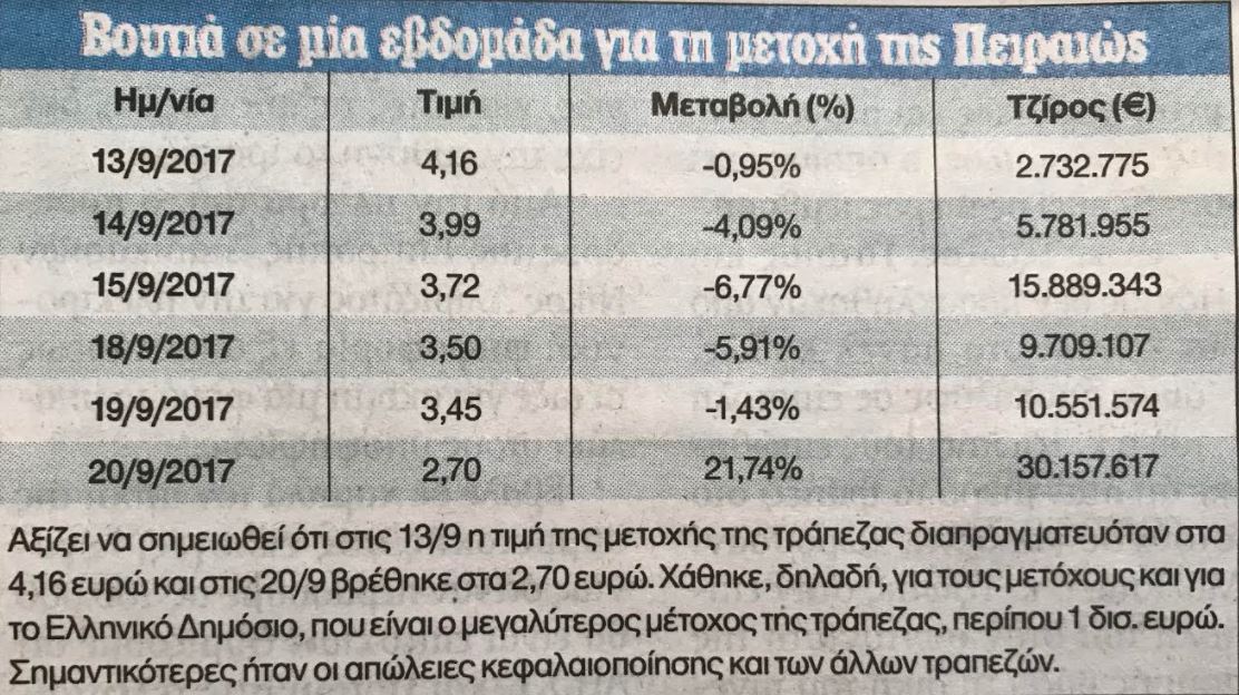 Αξίζει να σημειωθεί ότι στις 13/09 η τιμή της μετοχής της τράπεζας διαπραγματευόταν στα 4,16 ευρώ και στις 20/09 βρέθηκε στα 2,70 ευρώ. Είχε χαθεί δηλαδή για τους μετόχους και για το Ελληνικό Δημόσιο, που είναι ο μεγαλύτερος μέτοχος της τράπεζας, περίπου 1 δισ. Ευρώ. Σημαντικότατες ήταν οι απώλειες κεφαλαιοποίησης και των άλλων τραπεζών.